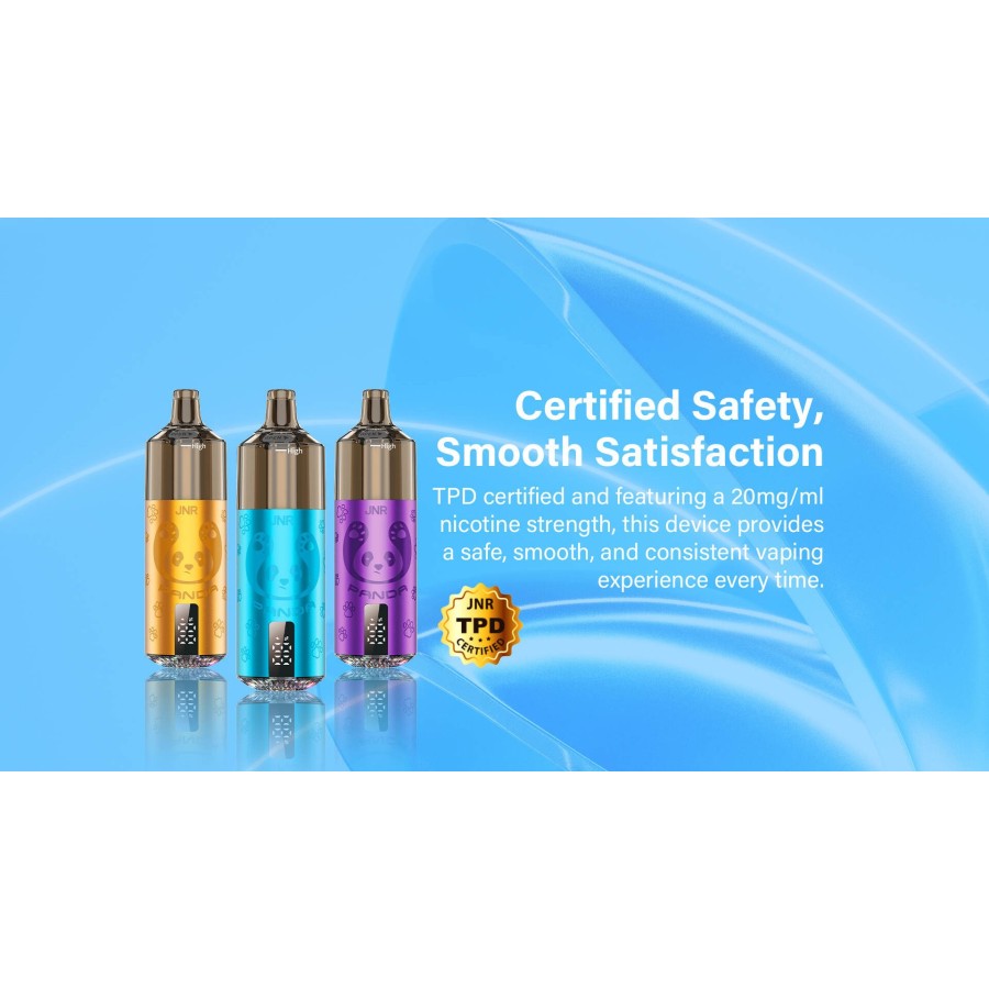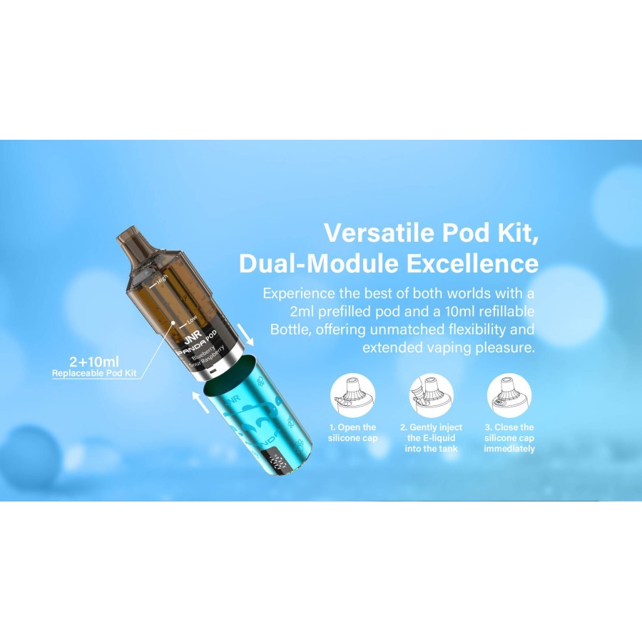 JNR Panda Cherry Ice offre une cerise juteuse portée par une fraîcheur mentholée nette. Le pod intègre un système pratique 2 ml pré-rempli + flacon 10 ml rechargeable pour des sessions longues, une batterie 850 mAh et une résistance dual mesh 1,2 Ω pour une restitution aromatique précise. L’écran intelligent affiche batterie/puffs, et la charge USB-C simplifie l’usage. Nicotine 2 % (TPD).